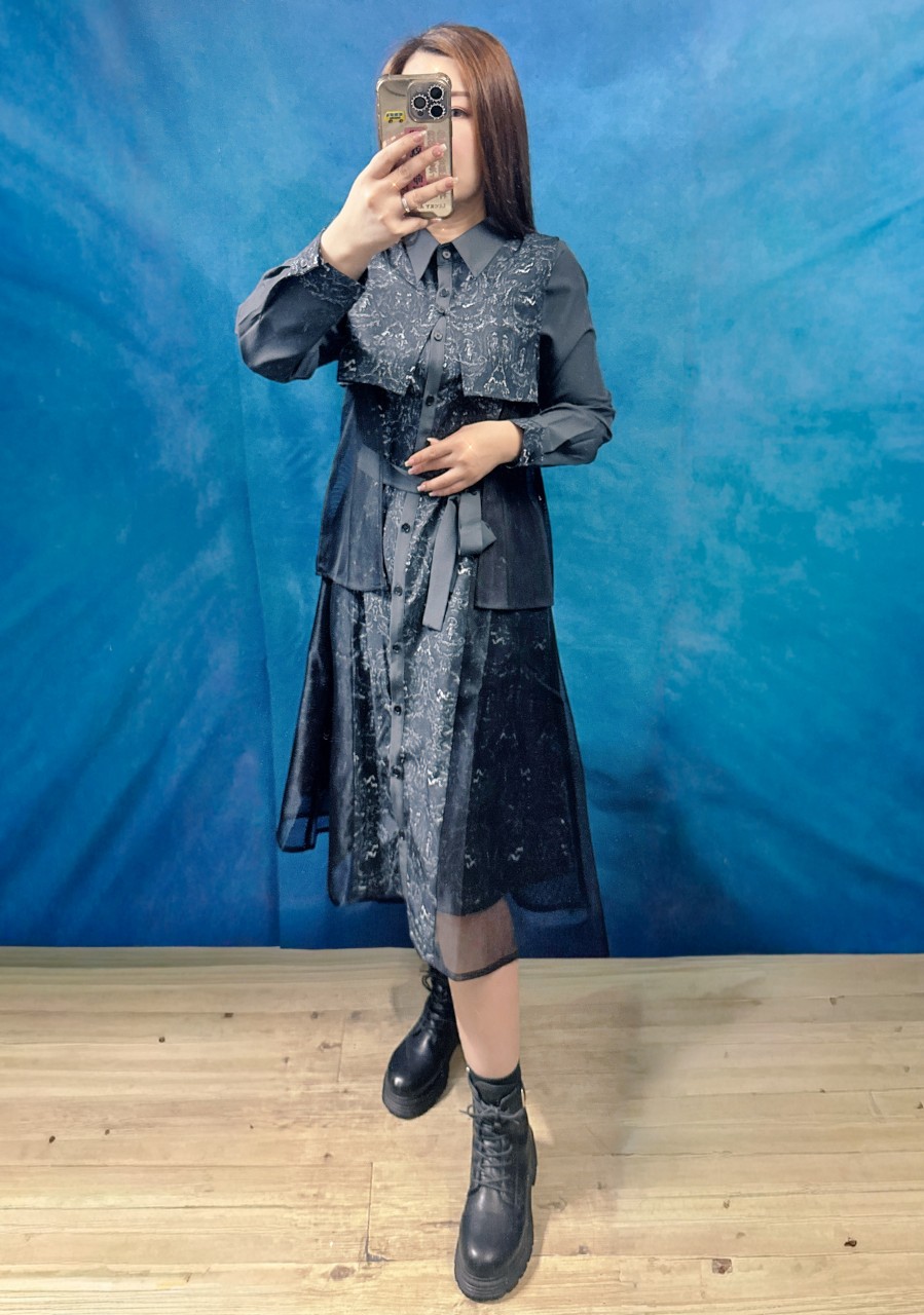 BS539 黑色 2件套 印花拼網格背心+印花布連身裙