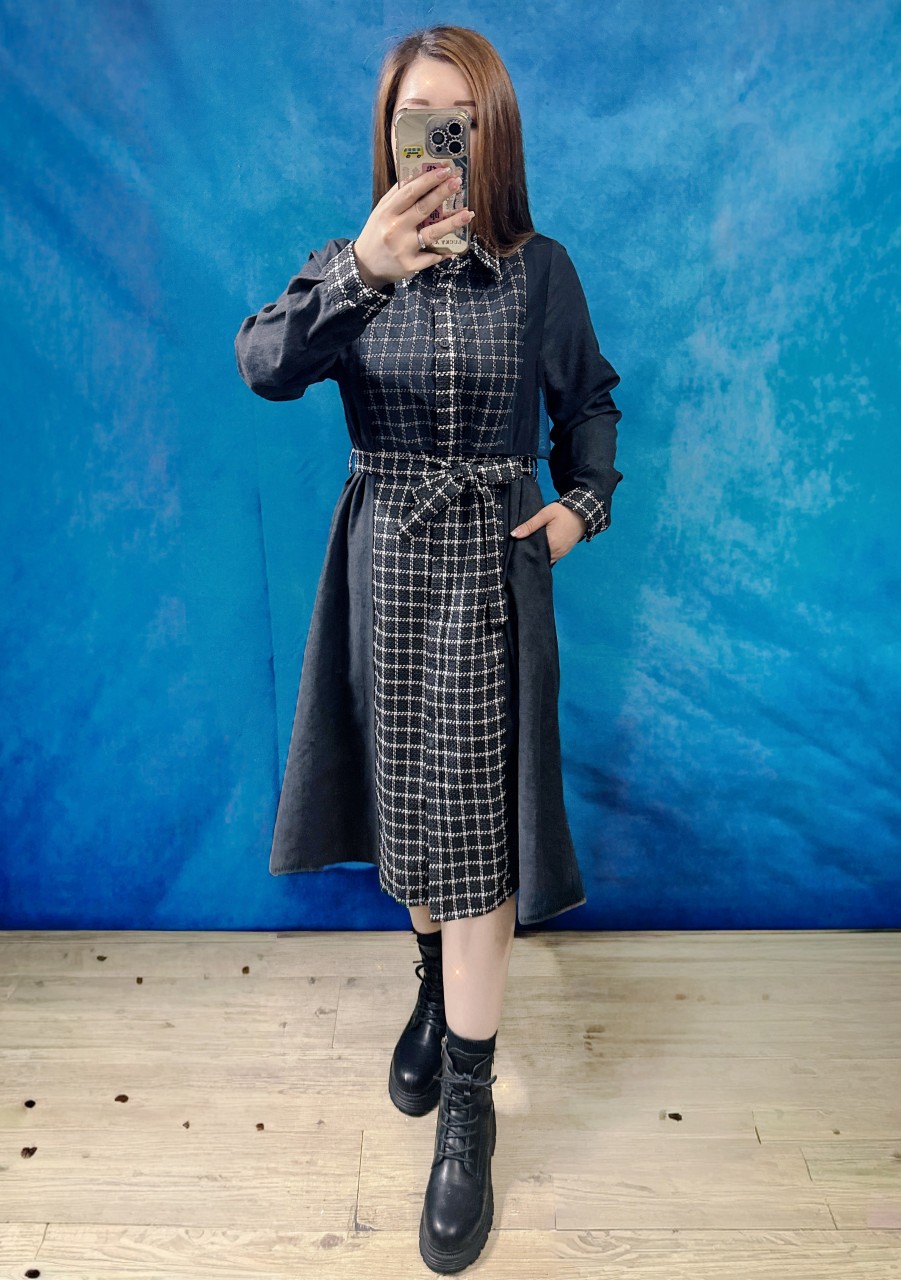 BS556 黑色 TWEEN格拼薄磨毛絨布裙